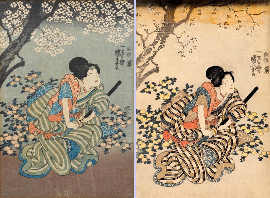 month of 1847 (censors Muramatsu and Yoshimura) Theater: Ichimura Publisher: Ebi-ya Rinnosuke NOTE: Two states of the right sheet are shown. I am grateful to Robert Pryor for this