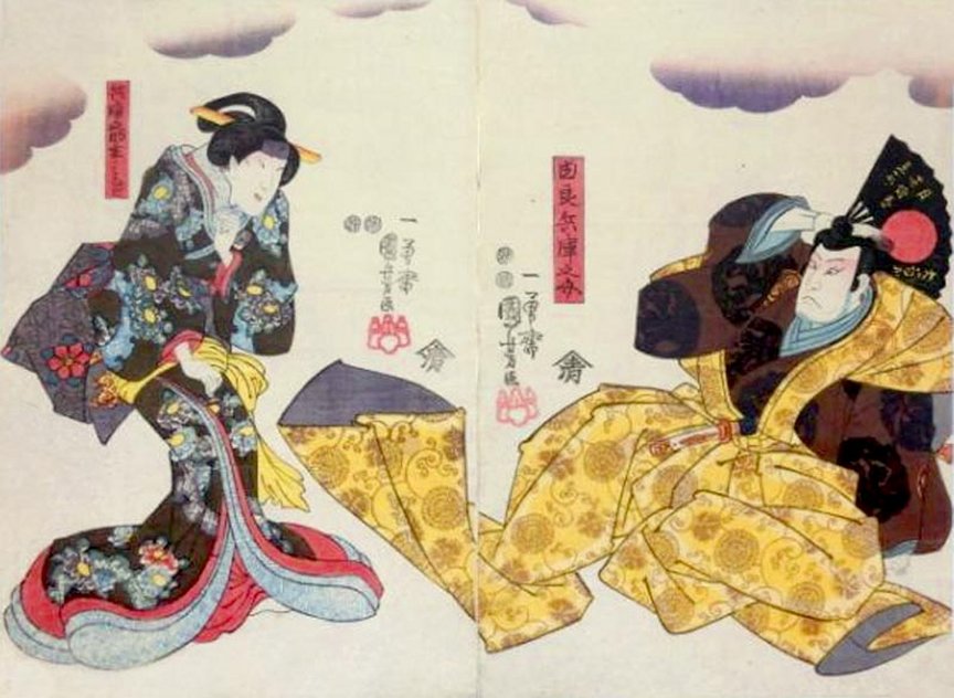Actors: Ichimura Uzaemon XII as Takechi Jûbei Mitsuhide (武智十兵衛光秀) and Bandô Shûka I as Jujiro’s wife,