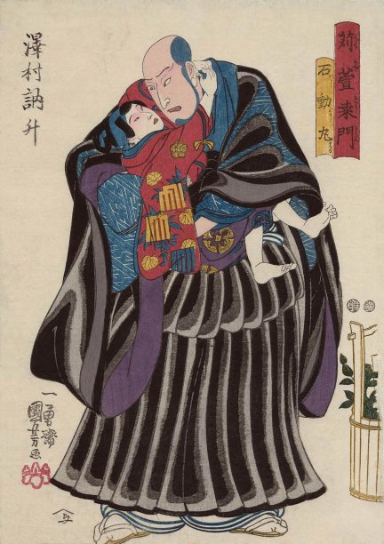 Actors: Sawamura Sojûrô V as priest Karukaya Doshin (苅萱桑門) holding