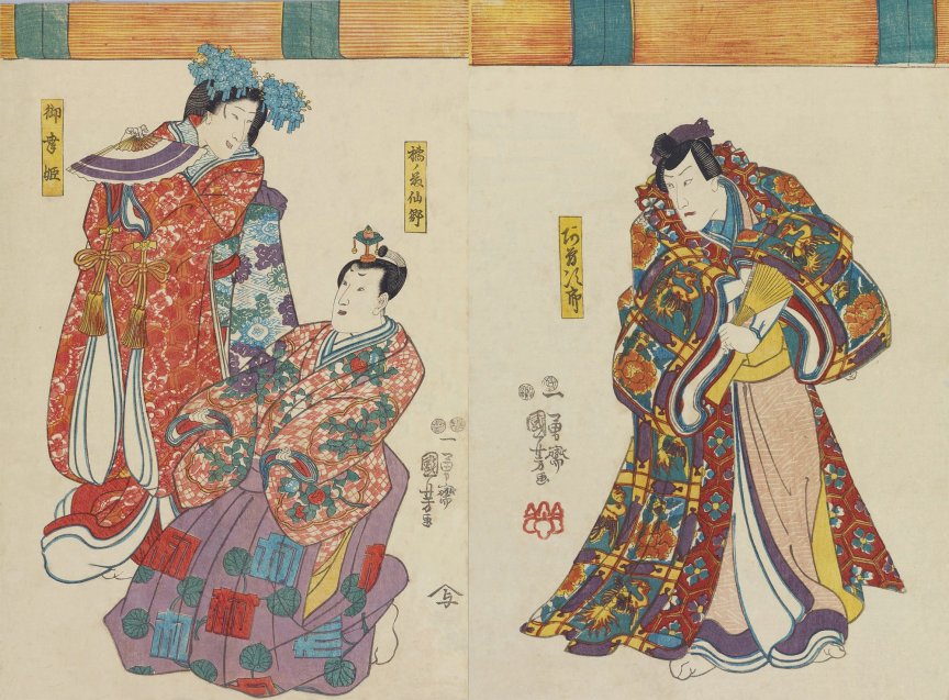month of 1848 (censors Hama and Kinugasa) Theater: Ichimura Publisher: Minato-ya Kohei Text on right sheet: The koto song, the morning