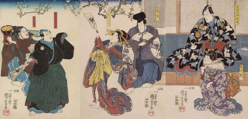 Ichikawa Kuzô II as Chichibu Shoji Shigetada (秩父の庄司重忠), Ichikawa Ebijurô IV as Wada no Yoshimori (和田の太郎義盛), and Iwai Kumesaburô III Kinugasa (Shigetada’s
