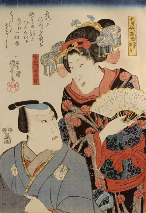 I as the courtesan Sugawara, actually Kiku no Mae (けいせい菅原 実ハ菊のまへ, left) and