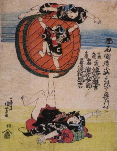 performing various balancing stunts Date: c. 1839 Publisher: Ise-ya Rihei |