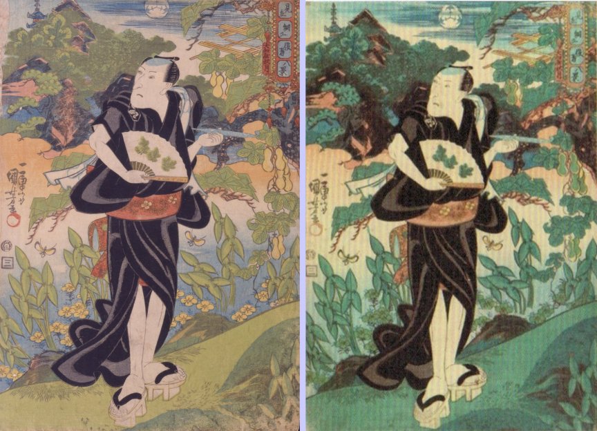 with fan under full moon View: Autumn moon (Akisuki, 秋月) Actors’ guild: Yamatoya (大和屋) NOTE: The red cartouche contains the name of the