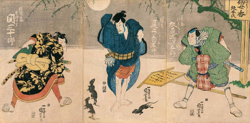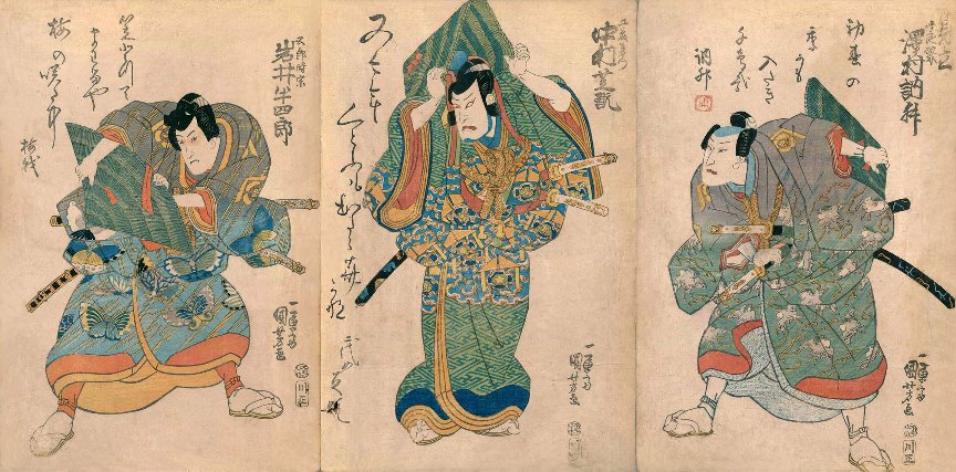 as Gorô Tokimune (五郎時宗, left), Onoe Kikugorô III as Jirokichi (次郎吉, center) and Bandô Mitsugorô IV in an