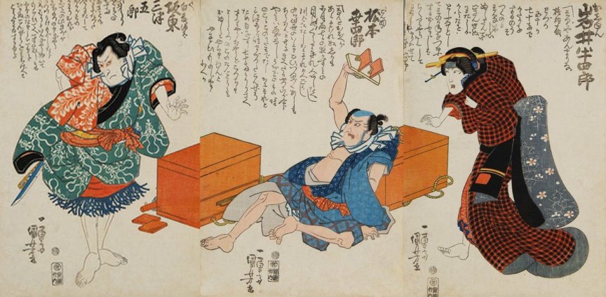 Actors: Bandô Mitsugorô IV as Shirafuji Genta (白ふじ 源太, left), Matsumoto Koshirô V as Gonsuke (権助, center), and Iwai