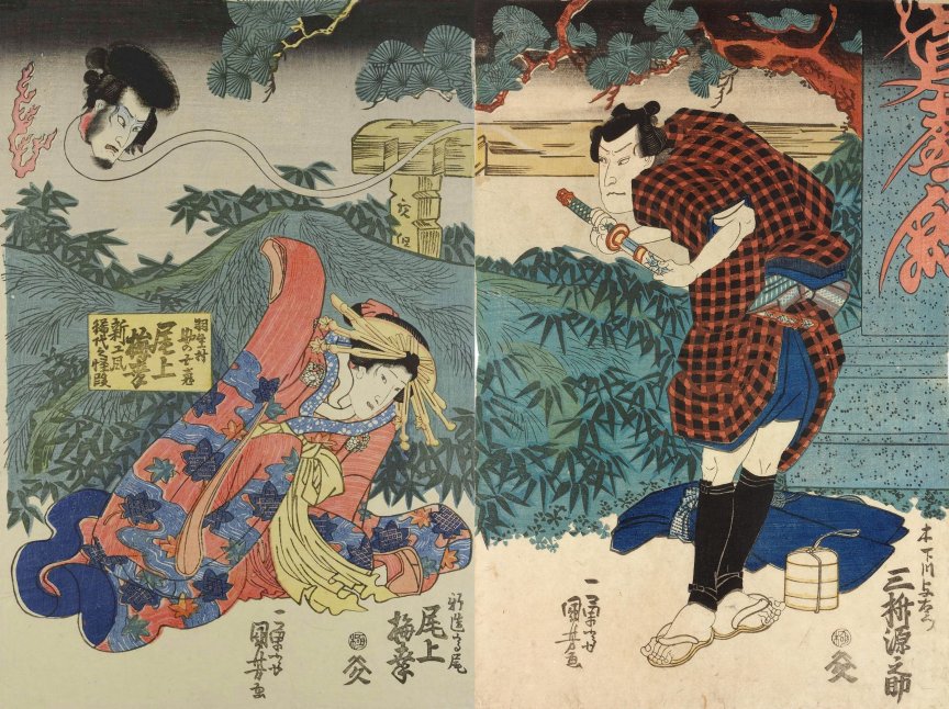 month of 1836 Theater: Ichimura Publisher: Yamamoto-ya Heikichi NOTE: The cartouche in the center panel reads Ghost of