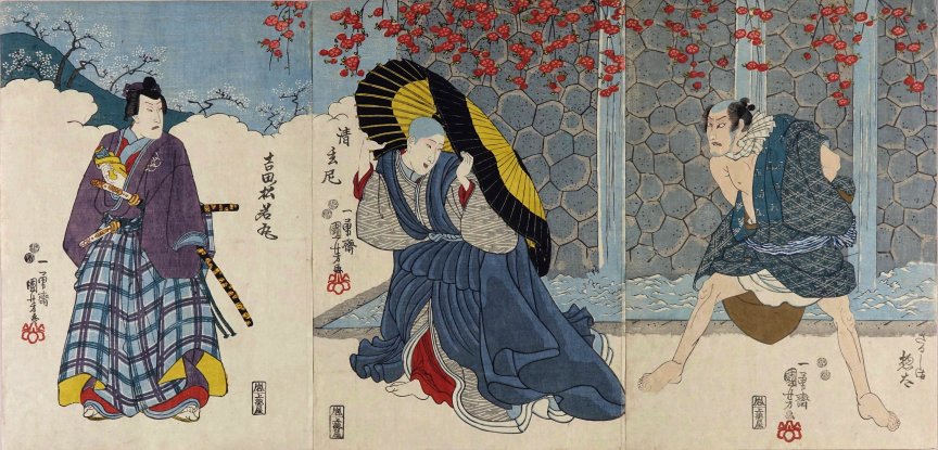 Actors: Ichikawa Danjûrô VIII as Dankurô (団九郎, left), Onoe Kikujirô II as Oren (おれん, center), and Bandô Hikosaburô V as Kichisuke (吉助, right) Play: Butai no Hana