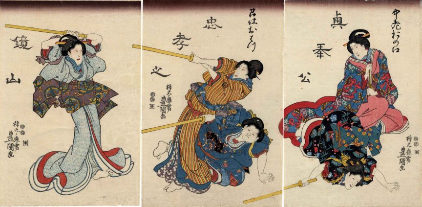 1848 (censors Muramatsu and Yoshimura) Theater: Kawarasaki Publisher: Ebi-ya Rinnosuke Texts: Right sheet: すりやこのざうりがおすみつき ふんじつの箱のなかにあつたゆゑ とうぞくは岩ふぢといはしやんすか コレようものを Center sheet: おもふてもみやしやんせ 大せつなおすみつきを どううろたへてわざわざわしが ざうりをいれてゆくあほうがあらう こりやきこへた あづかりてのこなさんが われとわかでにおすみつきをぬすみ わしが印のざうりをいれ この岩ふぢをつみにとつておとすのか いかにわしがやうなこゝろよしじやとてコレ Left sheet: サアお願ひと申は外の事でもござりませぬ たゞ今あれにてうけたまはりますれば 主人尾上をあなた殿のお相手になされて たち合とやらを御らんなされたは おのぞみ御ぞんじしられまするとふり おのへ事は町人の娘ではござりますれど おみやつかへを NOTE: The woodblocks for this triptych were originally