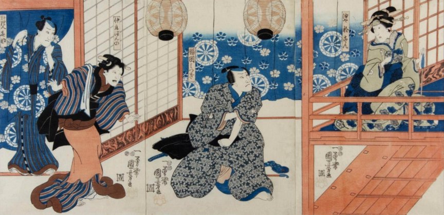忠臣蔵 十段目) Actors: Left sheet: Onoe Baiko IV as Osono (おその) Center sheet: Ichikawa Kuzô II as Amakawaya Gihei (天川屋義平) Right sheet: Sawamura Chôjûrô V as Ôboshi Yuranosuke (大星由良之助) and an unidentified actor the apprentice (decchi)