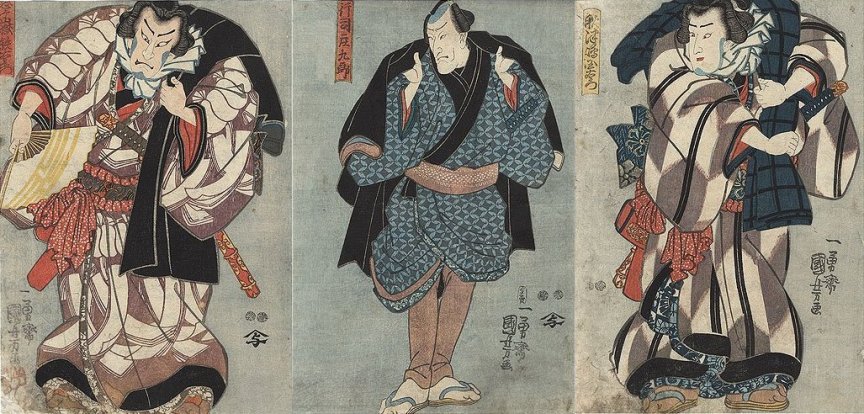 Actors: Sawamura Chôjûrô V as Harunaga (春永, left), Seki Sanjûrô III as Ranmaru (蘭丸, center), and Ichikawa Ebizô V as Takechi Mitsuhide (武智光秀, right) Play: Oda no Yuki Mitsugi