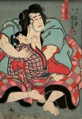Ichimura Uzaemon XII as sumô wrestler Akitsushima Kuniemon (秋津嶋, left) and