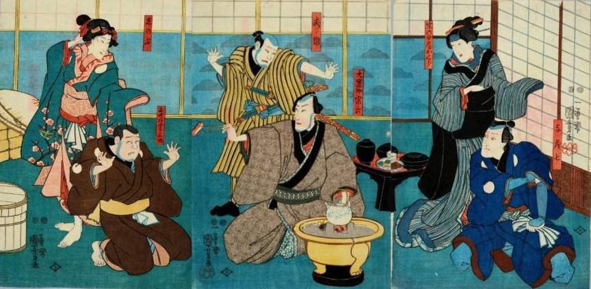 his retainer Iwabuchi (center) torture Ichikawa Kodanji