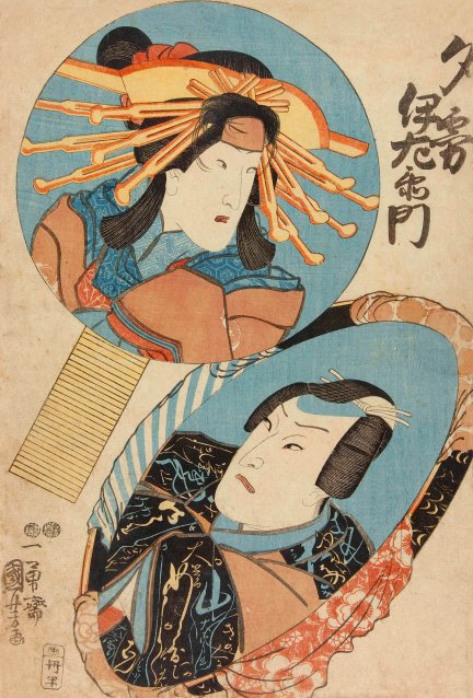wife Okura (宗六女房おくら) and Ichikawa Kuzô II as Yomoshichi (与茂七) Play: Hana Momiji tsui no uchikake (花紅葉一対裲襠) Date: 7th month of 1850 (censors