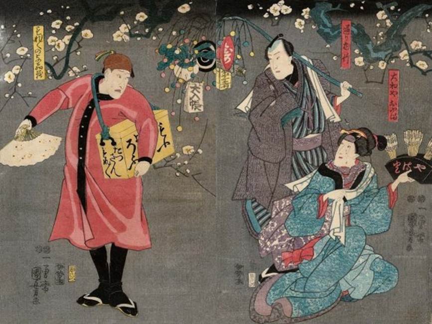 Actors: Onoe Baiko IV as Izumoya Okuni (いつもや於くに, left), Sawamura Chôjûrô V as Nagoya Sanza Motoharu (名古屋山三郎, center), Ichikawa Ebizô V as Fuwa Banzaemon (不波伴左エ門, right) Play: Date kurabe uwasa no sayaate (伊達競高評鞘当) Date: 1st month of 1851 Theater: Kawarasaki Publisher: Tsujioka-ya Bunsuke NOTE: This triptych was printed from woodblocks that were