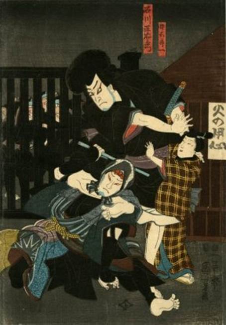 Actors: Ichikawa Kodanji IV as Ishikawa Goemon (石川五右衛門) and Seki Kasuke as his son Gorôichi (倅 五郎市) Play: Konoshita Soga megumi no