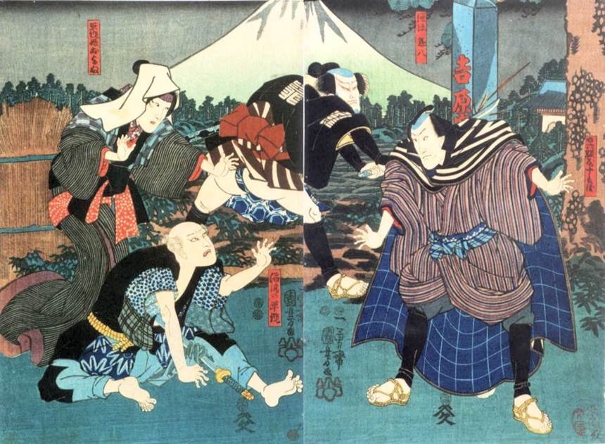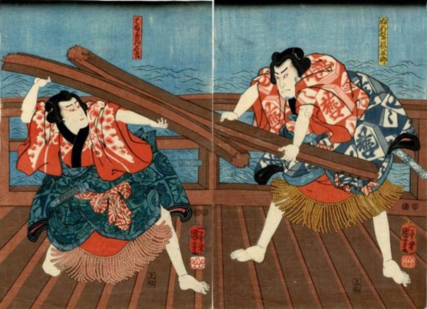 advancing towards Morita Kanya XI as Ko no Morono (right) after Bandô Takesaburô I as Enya Hangan Takasada (left) had been accused of breaking the