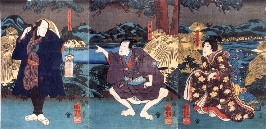 Actors: Bandô Hikosaburô IV as Ichimonjiya Saihei (一もんじや才兵衛, left), Bandô Takesaburô I as Hayano Kanpei (早野勘平, center), and