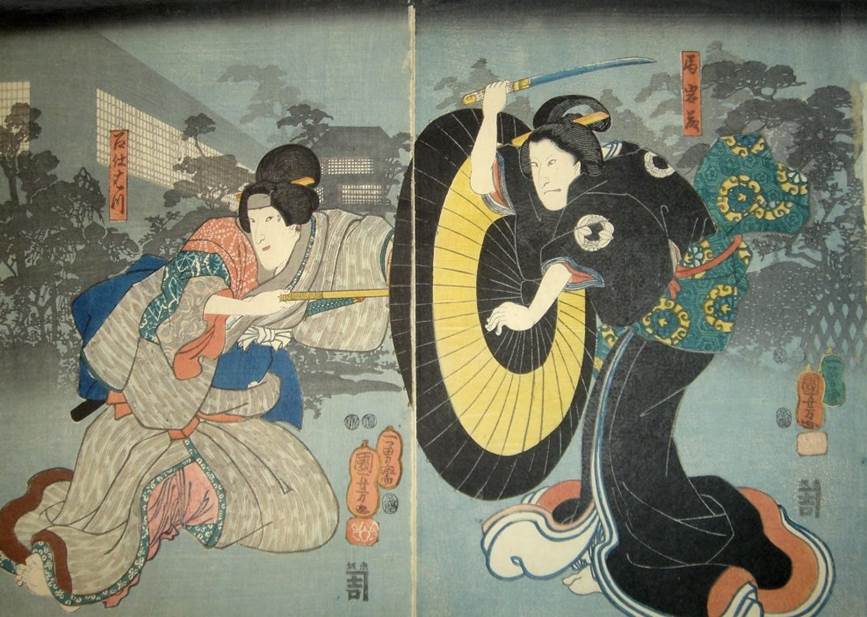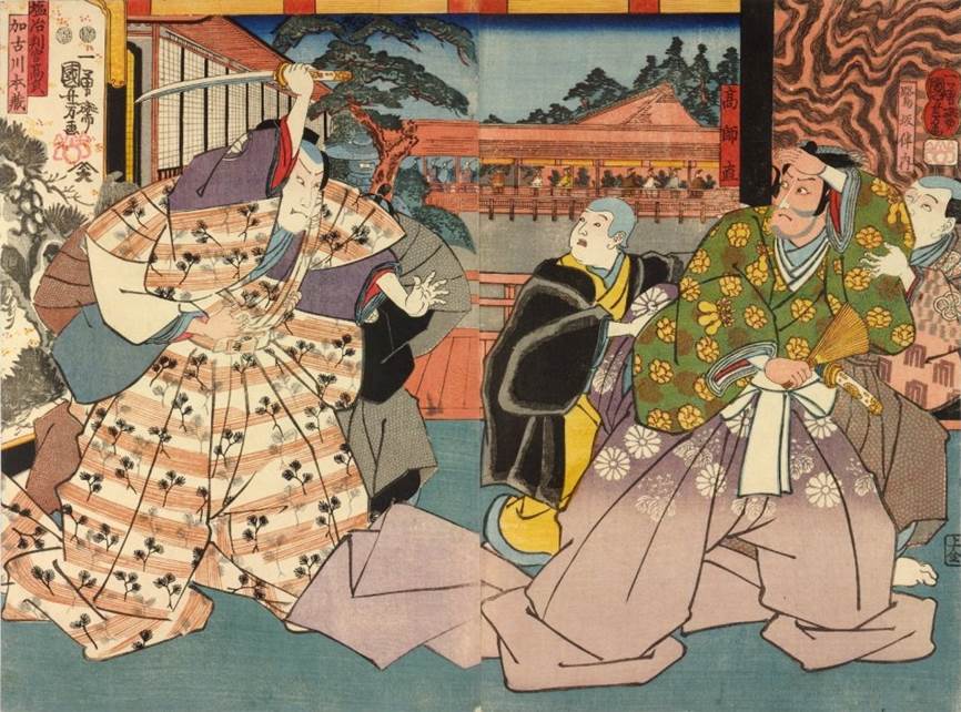 Actors: Bandô Takesaburô I as Enya Hangan Takasada (left) attacking Morita Kanya XI (Bandô Mitsugorô IV) as Ko no