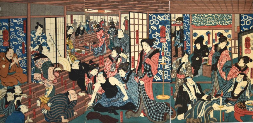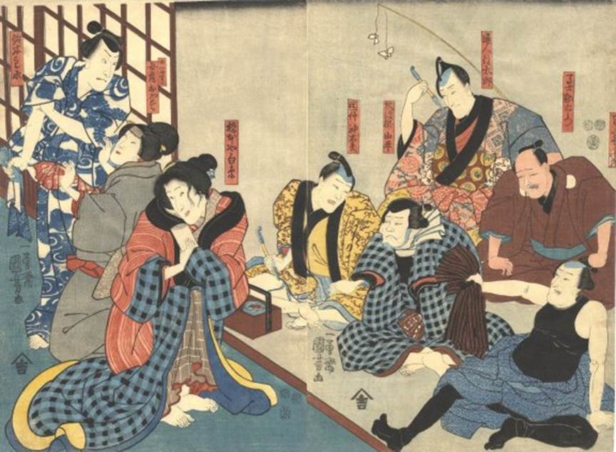 month of 1852 Theater: Ichimura Publisher: Yamaguchi-ya Tôbei NOTE: This is not a scene from the play. It shows the actors from Sumidagawa tsui no kagamon in a teahouse or brothel. Kuniyoshi used Western style perspective