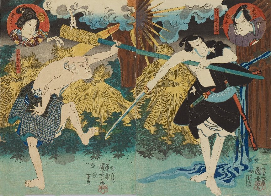 Actors: Ôtani Tomoemon IV as Tsukubane Sandaira (筑波根山平, standing) and