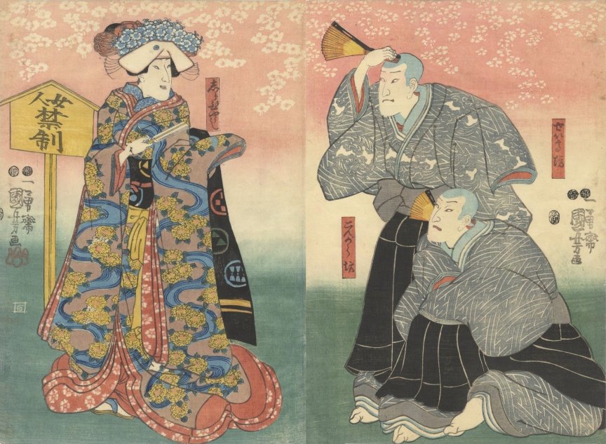I as Hayano Kanpei (早野 勘平) Right sheet: Onoe Baiko IV as Kanpei nyobo Okaru (かん平女房おかる) Play: Yayoi no hana