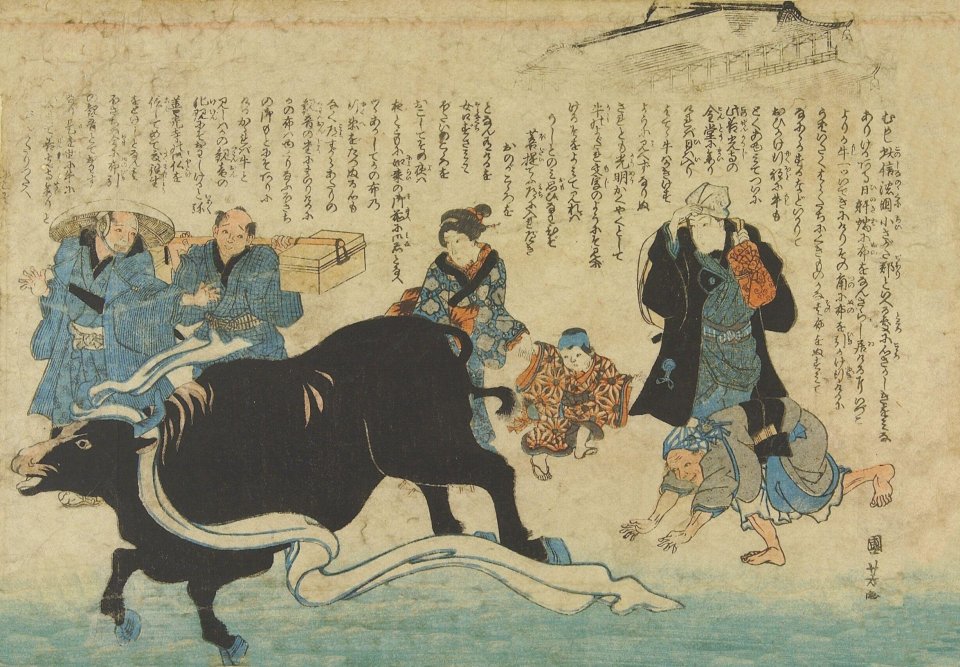 the Zenkoji temple by a bull Date: 1820s Size: 24.7 x 36 cm Publisher: No seal NOTE: This print illustrates