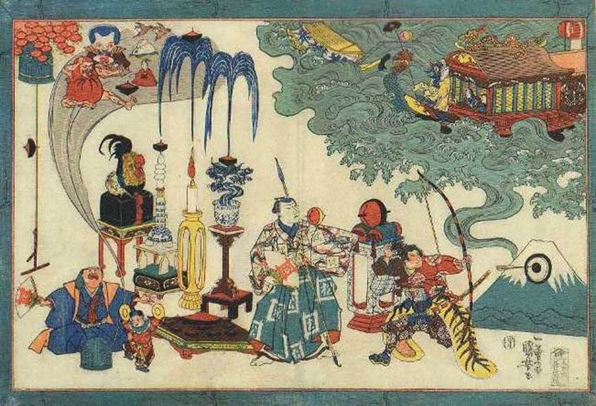 Performers Assembled to Wish a Happy New Year Description: Date: c. 1839 Publisher: Sano-ya Kihei |