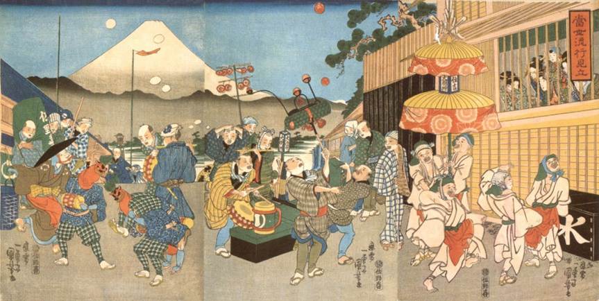 balancing acrobatics at Asakusa, Okuyama (浅草奥山) Date: 1847-1848