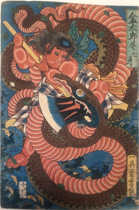 Subtitle: July (Shichigatsu, 七月) Scene: Kintarô fighting a giant serpent |