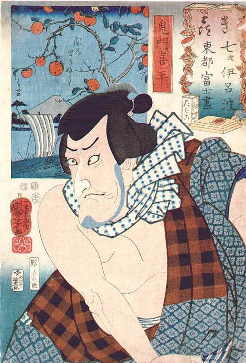 This series of prints shows bust portraits of kabuki actors in character in front of a view of Mount Fuji as seen from Edo (modern Tokyo). The cartouche in the right upper corner is bordered by objects from the play. Instead of being numbered, the right upper corner of each cartouche contains a syllable that may be arranged in an alphabet-like order called iroha. This series is listed as number 181 in Kuniyoshi by Basil William Robinson (Victoria and Albert Museum, London, 1961). The prints in this series are each about 14 by 10 inches (36 by 25 centimeters), a size known as ôban. I am grateful to Ward Pieters for assisting with this series. |