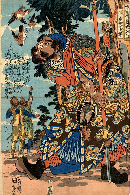 Kyumonryô Shishin (九紋龍史進), bare-chested and tattooed, armed with a pole,