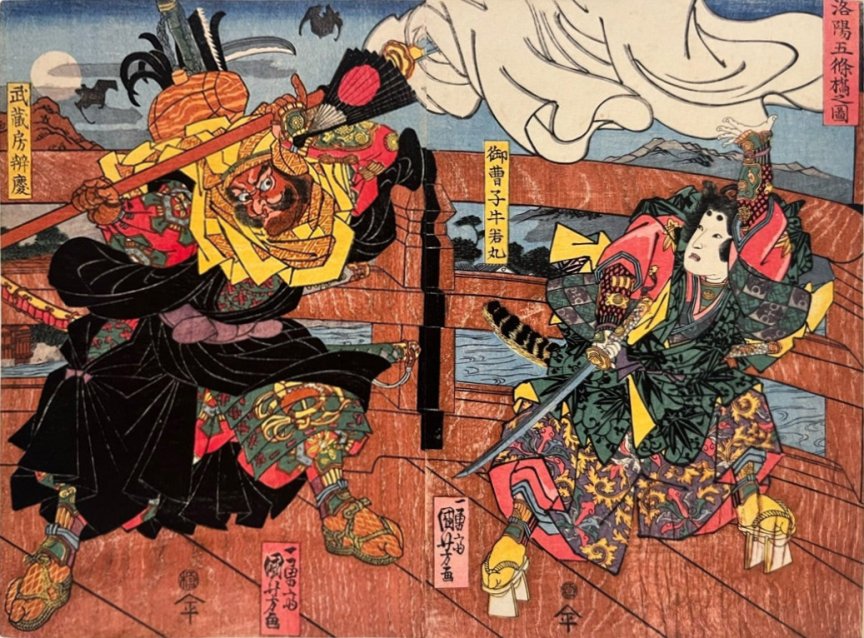 Gojô Bashi no zu, 洛陽五條橋之図) Description: Musashibô Benkei (武蔵房辨慶, left)